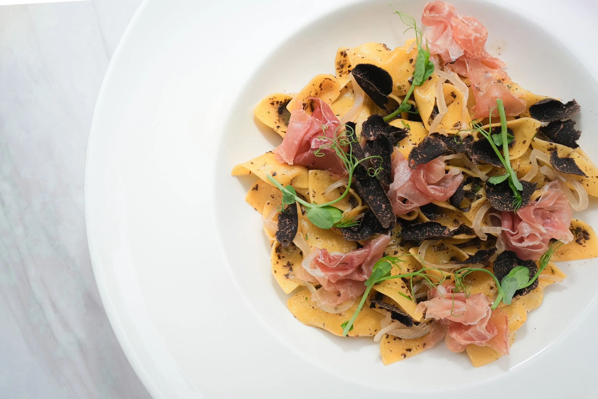 Hand-Rolled Egg Pasta, Truffle Butter Sauce, Pickled Shallots, Shaved Black Truffles